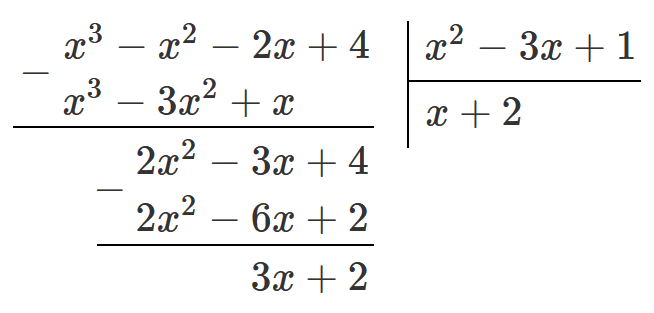 Найдите остаток от деления многочлена на многочлен: $\displaystyle (3x^4- 9x^3+2x^2-10x$ $\displaystyle +18):(3x^3+$ $\displaystyle 2x-$ $\displaystyle 4)$.