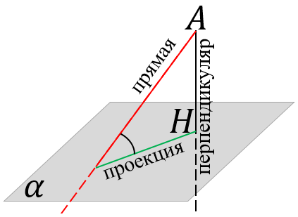 Если точка $\displaystyle A$ не принадлежит плоскости $\displaystyle \alpha,$ то проведение такой прямой называют опущением или проведением перпендикуляра на указанную плоскость из точки $\displaystyle A$ на плоскость $\displaystyle \alpha,$ а прямую, проходящую через точку $\displaystyle A$ и точку $\displaystyle H$ пересечения перпендикуляра и плоскости (основания перпендикуляра) называют проекцией этой прямой на плоскость $\displaystyle \alpha.$