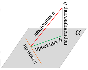 Если через некоторую точку вне плоскости $\displaystyle \alpha$ проведены перпендикуляр $\displaystyle h$ к плоскости $\displaystyle \alpha$ и прямая $\displaystyle a$ - наклонная к плоскости $\displaystyle \alpha,$ прямая $\displaystyle b$ является проекцией прямой $\displaystyle a$ на плоскости $\displaystyle \alpha,$ и в плоскости $\displaystyle \alpha$ содержится некоторая прямая $\displaystyle c,$ то: