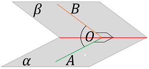 Если из некоторой точки $\displaystyle O$ на прямой $\displaystyle c$ провести в указанных полуплоскостях двугранного угла лучи $\displaystyle OA$ и $\displaystyle OB$ где $\displaystyle A \in \alpha, OA \perp c$ и $\displaystyle B \in \beta, OB \perp c,$ то угол, образованный этими лучами, называется линейным углом двугранного угла между плоскостями $\displaystyle \alpha$ и $\displaystyle \beta.$