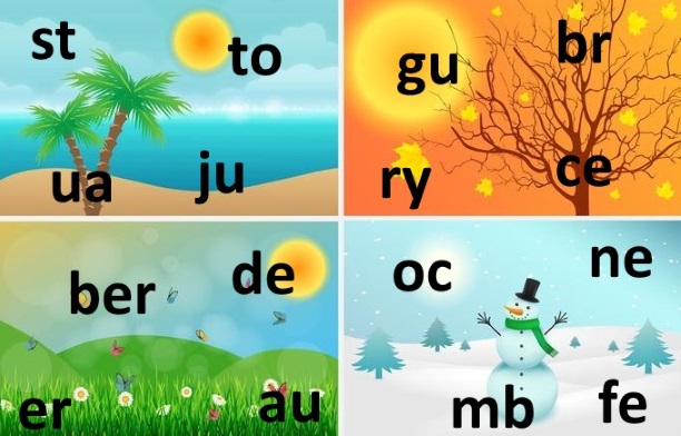 Помоги зиме, весне, лету и осени найти свои месяцы (напиши на английском их названия в соответствующие поля по календарному порядку (не забывай, что первый месяц зимы - декабрь)