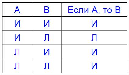 Импликация считается ложным высказыванием только в том случае, когда условие истинно, а заключение ложно.