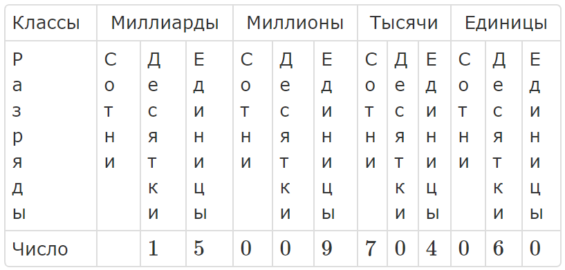 В таблице записано число $\displaystyle 15$ миллиардов $\displaystyle 9$ миллионов $\displaystyle 704$ тысячи $\displaystyle 60$.