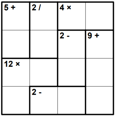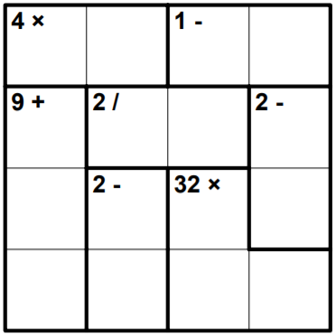 Разгадайте кендоку: заполните клетки числами от $\displaystyle 1$ до $\displaystyle 4$ включительно так, чтобы в каждой строке и в каждом столбце числа не повторялись. Число, которое записано в углу каждого выделенного блока - это результат сложения, вычитания, умножения или деления в этом блоке. Числа внутри блока могут повторяться.
