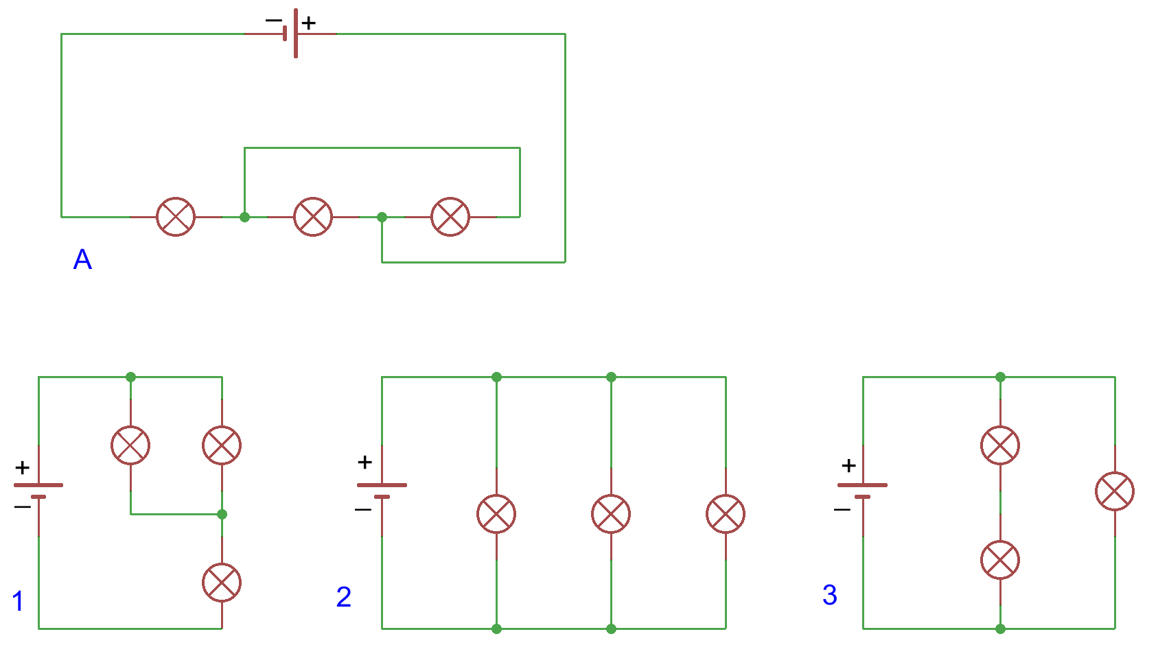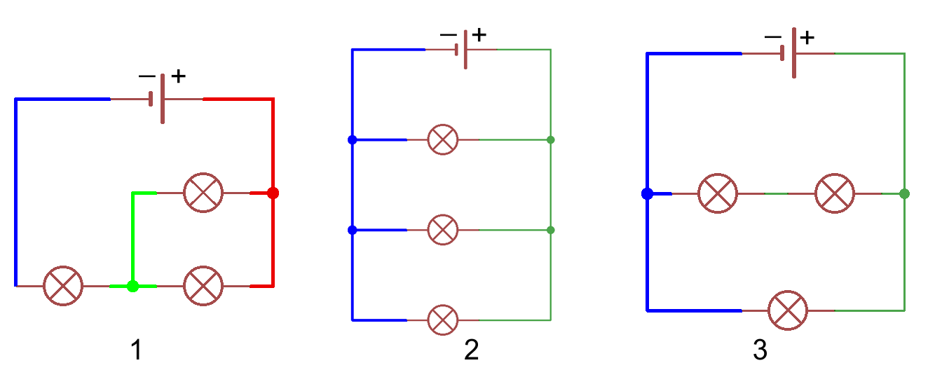 На схеме $\displaystyle A$ синий провод идет только к одной лампочке, на схеме $\displaystyle 2$ - сразу к трем лампочкам, а на схеме $\displaystyle 3$ - к двум лампочкам.