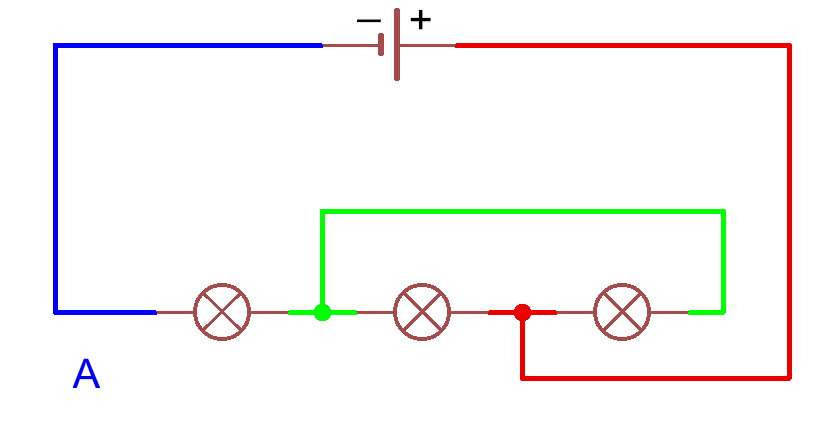 На схеме $\displaystyle A$ остался еще один провод, который соединяет выводы трех лампочек между собой и больше никуда не идет. Его раскрасим зеленым.