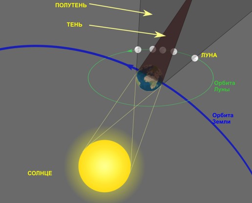 Луна вращается вокруг Земли, и когда Луна попадает в тень Земли, наступает лунное затмение.