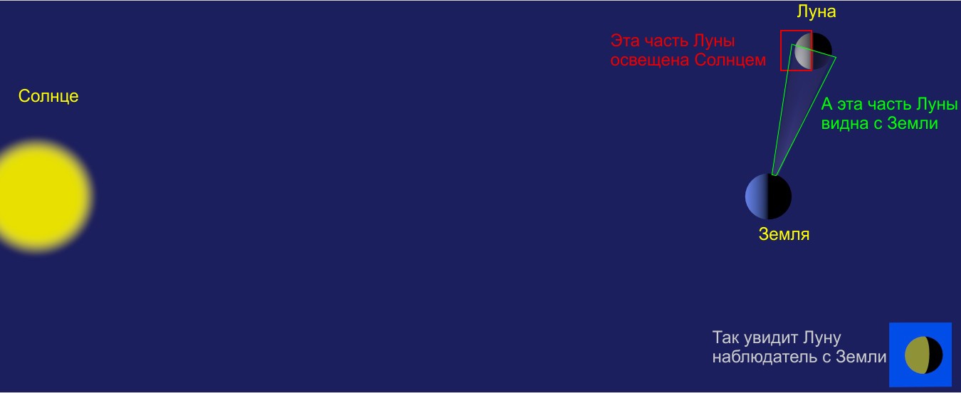 На рисунке схематично показано расположение Солнца, Земли и Луны. Повернутая к Солнцу сторона Луны освещена Солнцем. Конечно, рисунок сделан без соблюдения масштаба - Земля и Луна изображены слишком большие и близко к Солнцу.