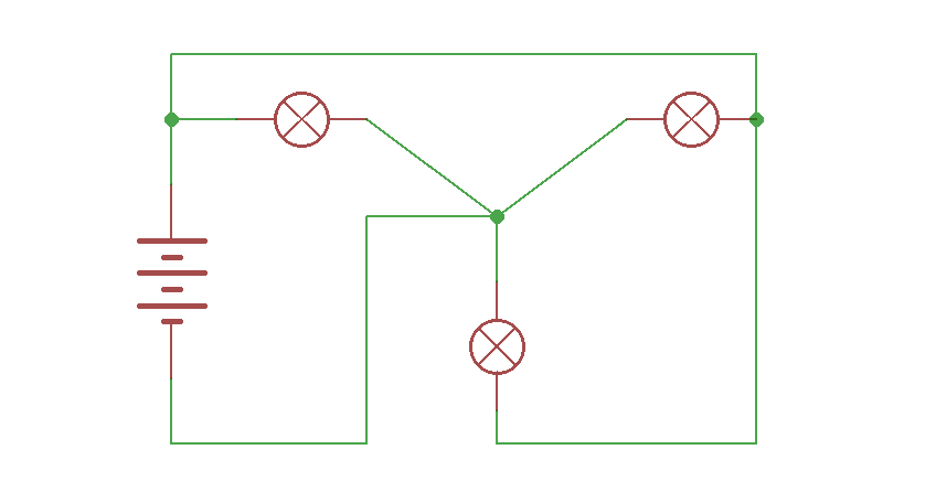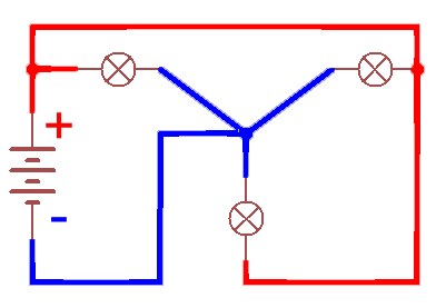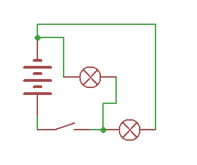 На обеих схемах от верхнего вывода батарейки можно по проводам добраться до обеих лампочек.