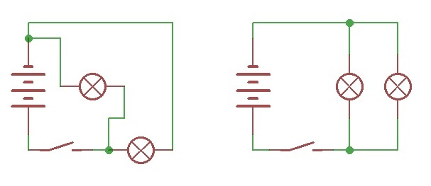 Вторые выводы лампочек тоже соединены вместе на обеих схемах, и туда же подсоединен выключатель.