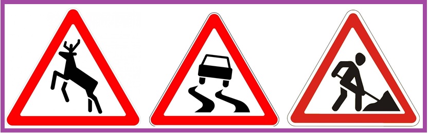 Они треугольные, бело-красного цвета, между собой знаки этой группы различаются рисунком внутри треугольника.