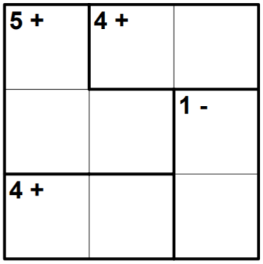Разгадать кендоку: заполнить клетки числами от $\displaystyle 1$ до $\displaystyle 3$ включительно так, чтобы в каждой строке и в каждом столбце числа не повторялись. Число, которое записано в углу каждого выделенного блока - это результат сложения или вычитания в этом блоке. Числа внутри блока могут повторяться.