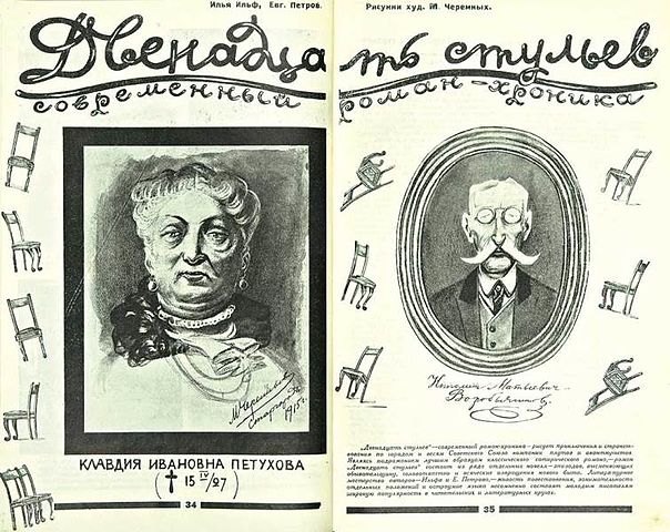 Ей снились девушки в кушаках, лошади, обшитые жёлтым драгунским кантом, дворники, играющие на арфах, архангелы в сторожевых тулупах, прогуливающиеся по ночам с колотушками в руках, и вязальные спицы, которые сами собой прыгали по комнате, производя огорчительный звон. (И. Ильф, Е. Петров «Двенадцать стульев»).