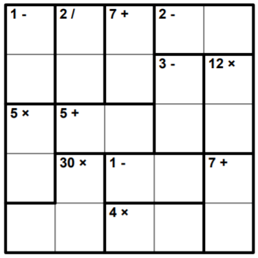 Разгадайте кендоку: заполните клетки числами от $\displaystyle 1$ до $\displaystyle 5$ включительно так, чтобы в каждой строке и в каждом столбце числа не повторялись. Число, которое записано в углу каждого выделенного блока - это результат сложения, вычитания, умножения или деления в этом блоке. Числа внутри блока могут повторяться.